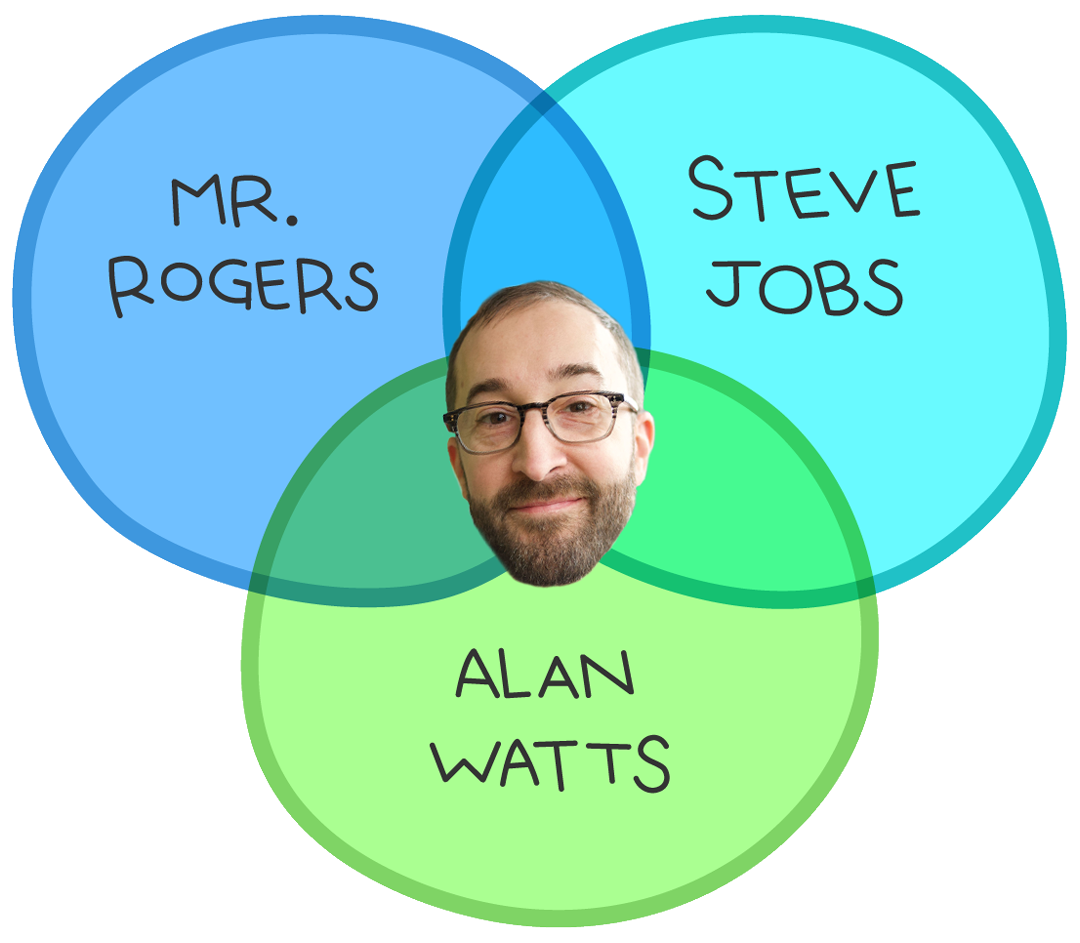 Why those three people? Well, with Steve Jobs, I share a love of simplicity, creating elegantly intuitive products, and wowing customers. With Mr. Rogers, I share a love of delighting people, empowering them to be their best selves, and I believe that telling meaningful stories can change the world. And Alan Watts and I share a love for philosophy, exploring the deep mysteries of the universe, and we both are known for maintaining excellent facial hair.