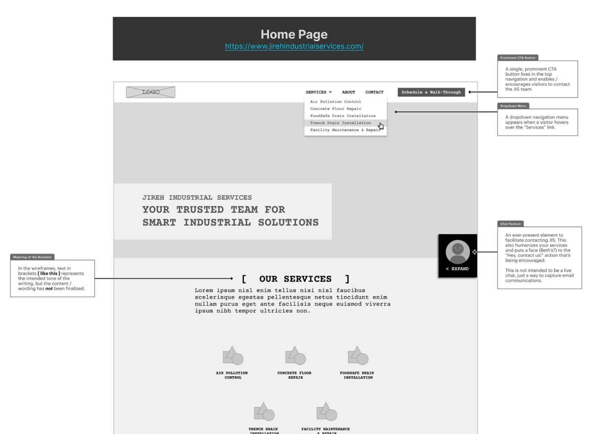 This phase of a project is all about flow & functionality, not aesthetics. So, my wireframes are always presented in grayscale, using a simple Courier type system & primitive graphic elements.