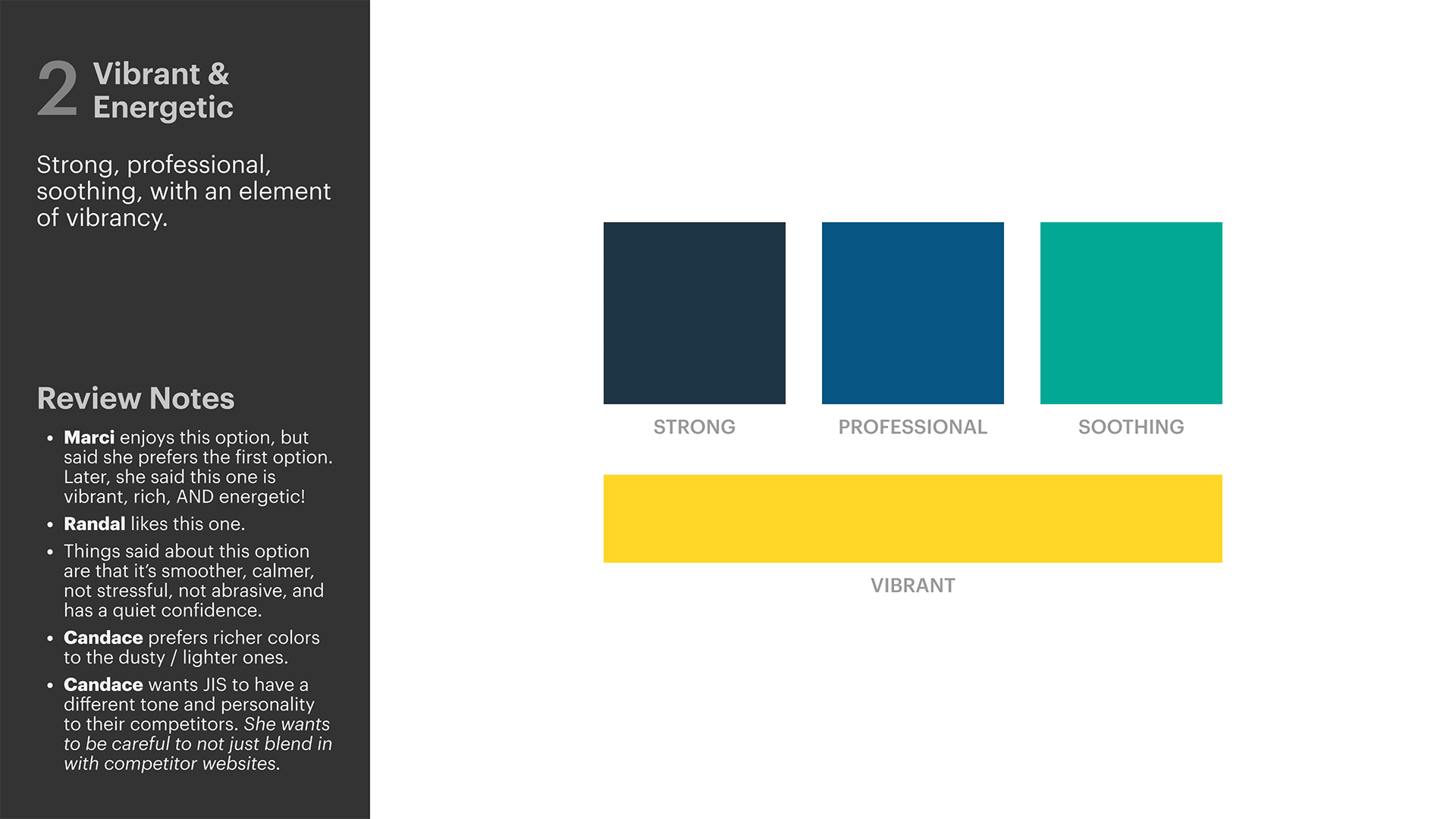 This were the distilled Color Options, Competitive Analysis, and typeface combinations I presented. This gave the needed context to understand what I was presenting and the “why” behind it.
