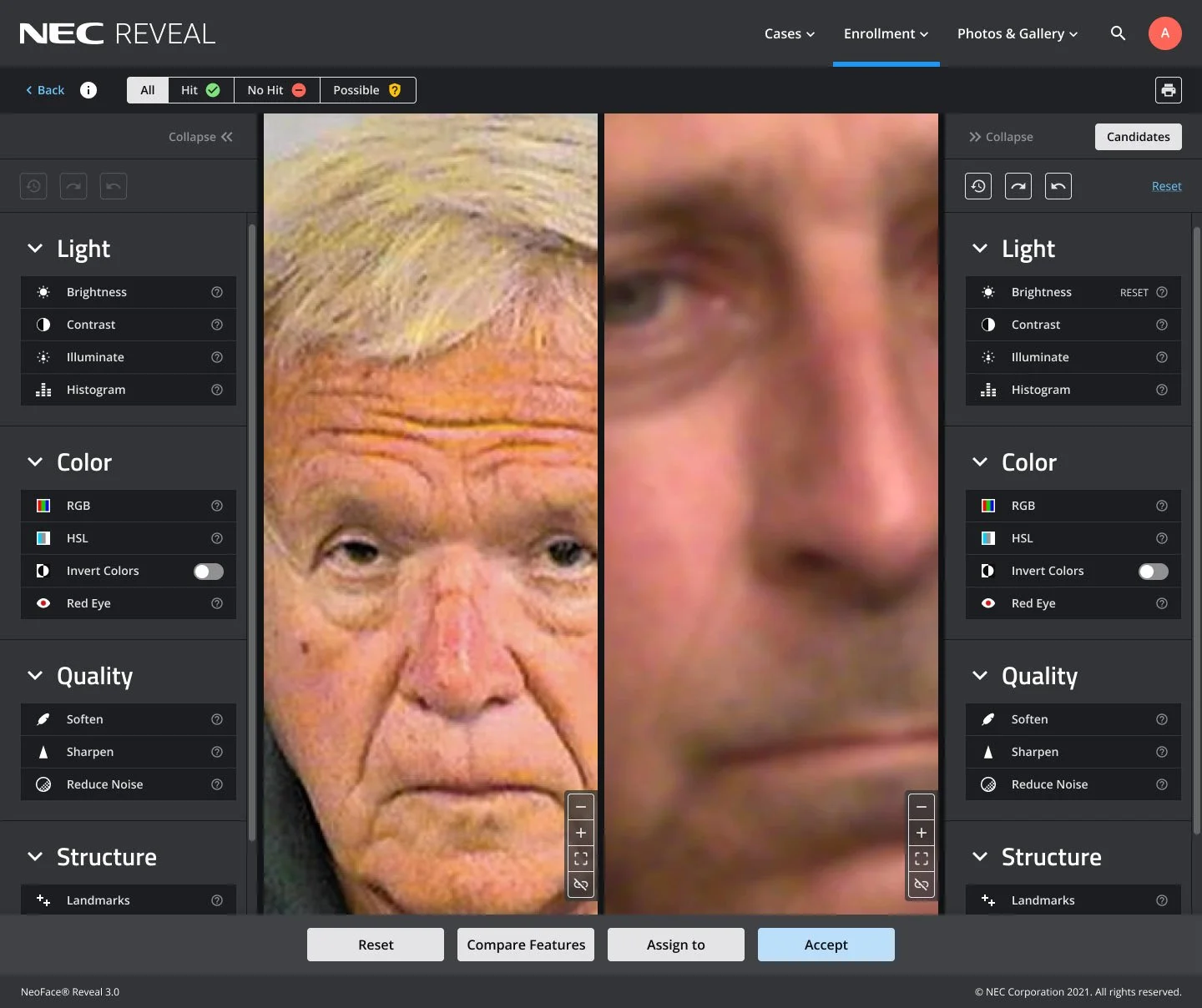 This UI state enables users to edit and compare two images simultaneously. This is where investigators look for defining features, inconsistencies, or confirming details that indicate whether the subjects are the same person. The side-by-side workflow reduces errors and speeds up high-stakes identification work.