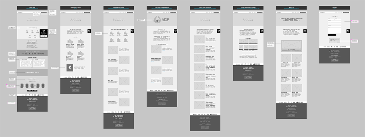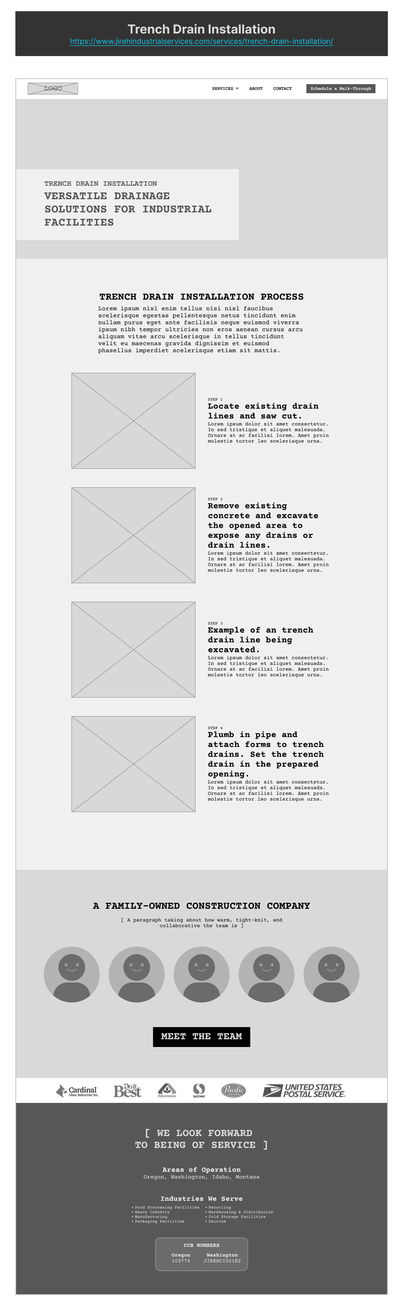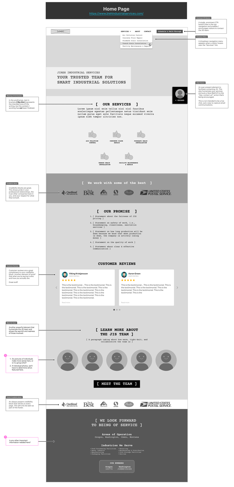 This page needed to transform a highly technical service into something easy to understand, while still inspiring confidence. Even before the final content was written, the wireframe made clear how the page would guide users from problem recognition to trust-building to action. Each step was separated so visitors could quickly scan through and see that JIS had the expertise they needed.